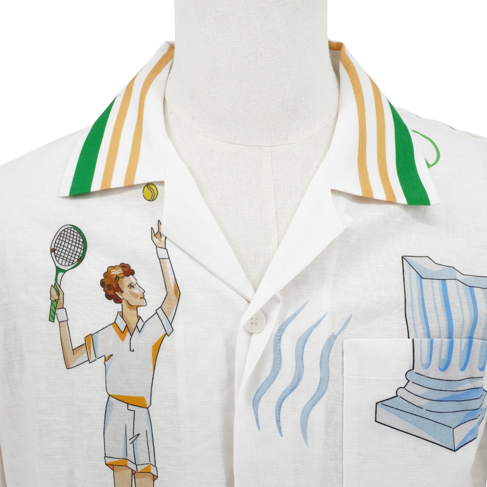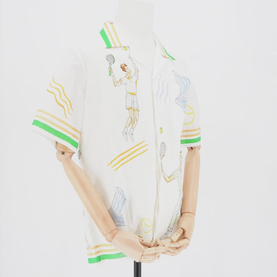 Una pieza de diseño vibrante que encapsula el lujo relajado. Presenta ilustraciones detalladas de jugadores de tenis y arquitectura clásica, con un cuello camp y un corte recto que define la silueta moderna de la marca.
