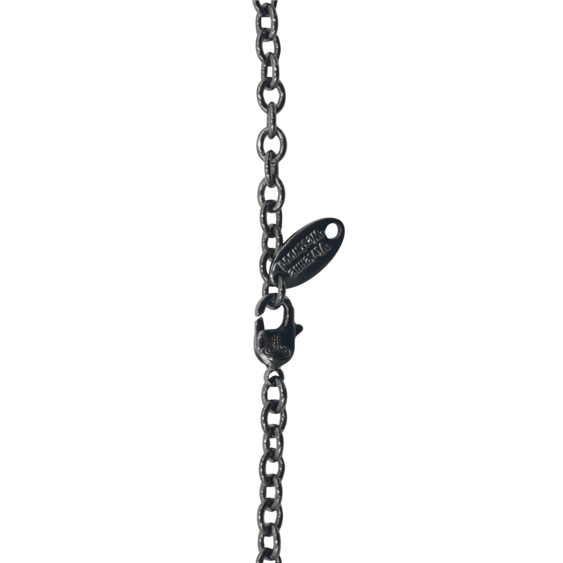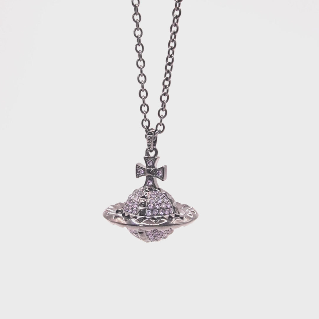 El Tiny Orb Pendant es uno de los diseños más reconocibles de Westwood. Esta iteración destaca por su acabado gunmetal, que ofrece una estética más industrial y vanguardista, resaltada por la profundidad de los cristales violetas incrustados en la esfera central.