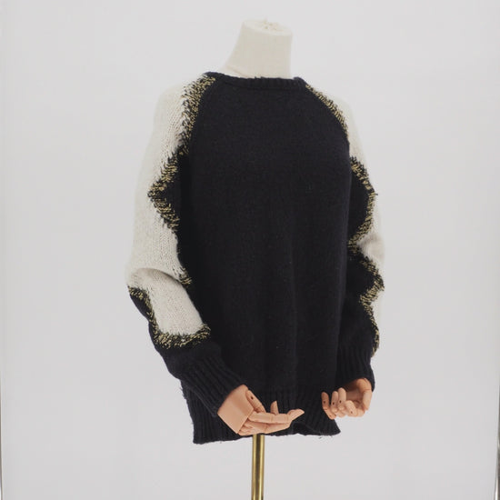 Un diseño audaz que define la estética rock-chic de Saint Laurent. Este suéter de jacquard combina una silueta clásica de cuello redondo con un patrón de rayos que aporta dinamismo y un carácter rebelde pero sofisticado.
