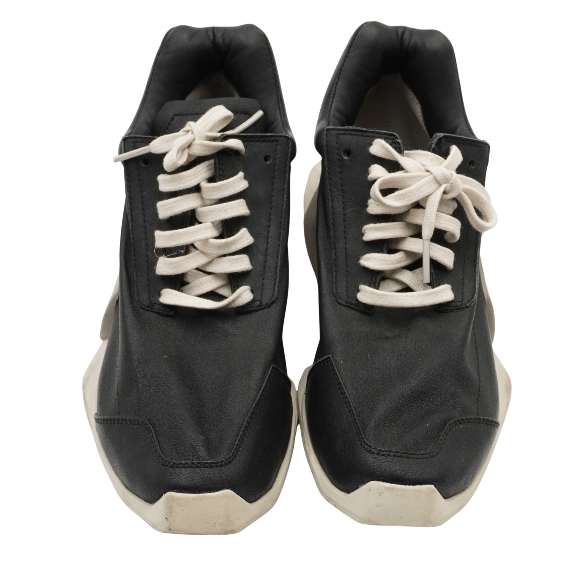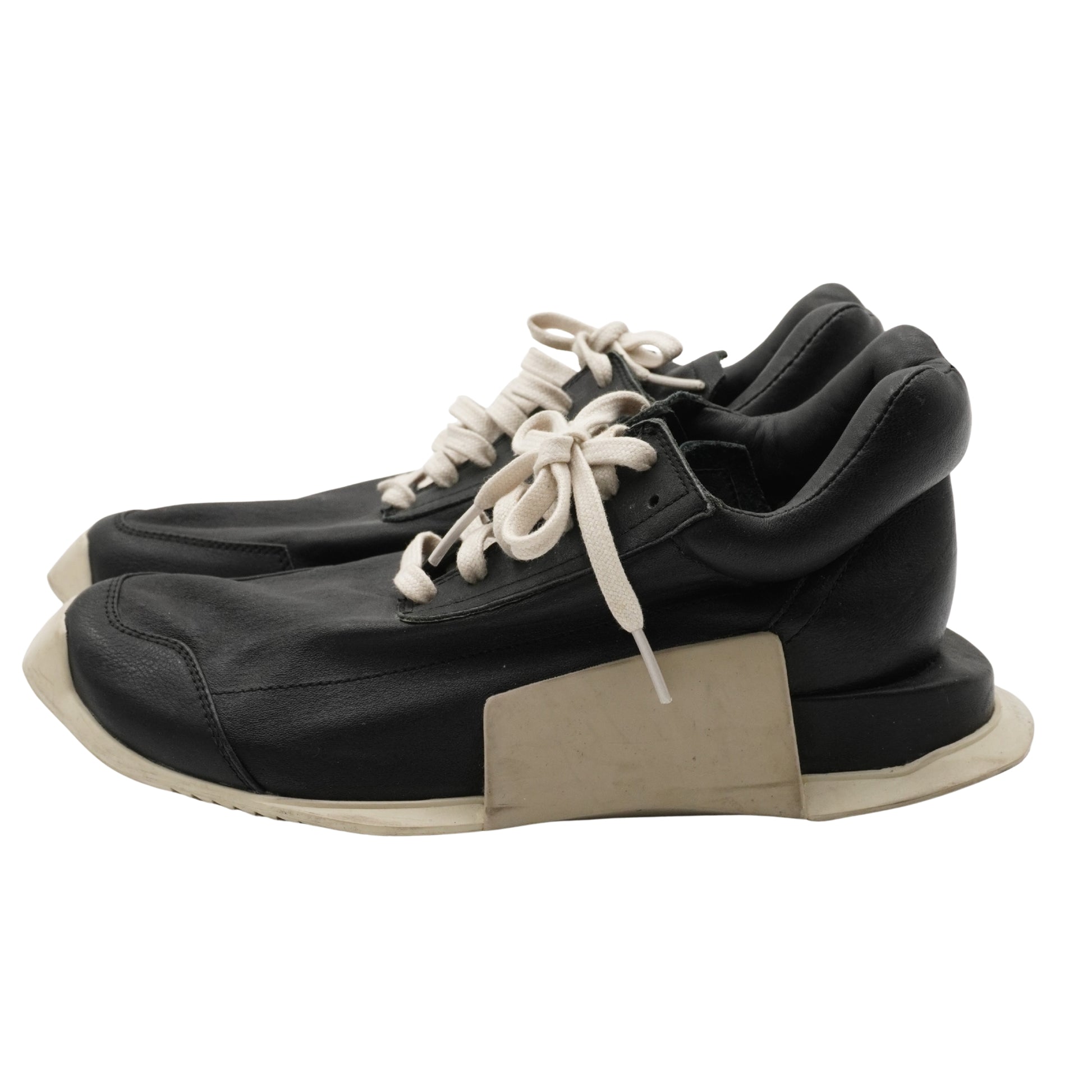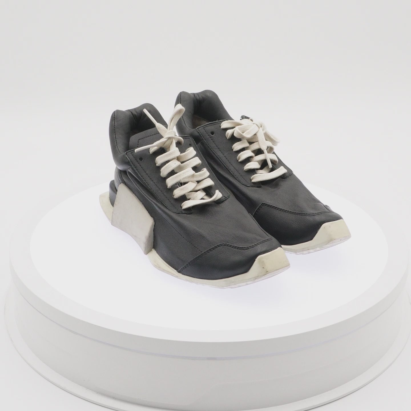 Una pieza fundamental del diseño contemporáneo que fusiona el calzado deportivo con la alta costura. Destaca por su volumen exagerado, suela geométrica dentada y una construcción robusta en piel que define el lujo subversivo de Rick Owens.